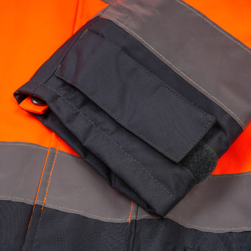 - 2 large outer zippered hand pockets (waterproof) – designed to hold traffic gloves, a radio, or a small flashlight (essential for traffic control). The pockets are positioned high on the hips to avoid interference when bending or kneeling to set up cones.
